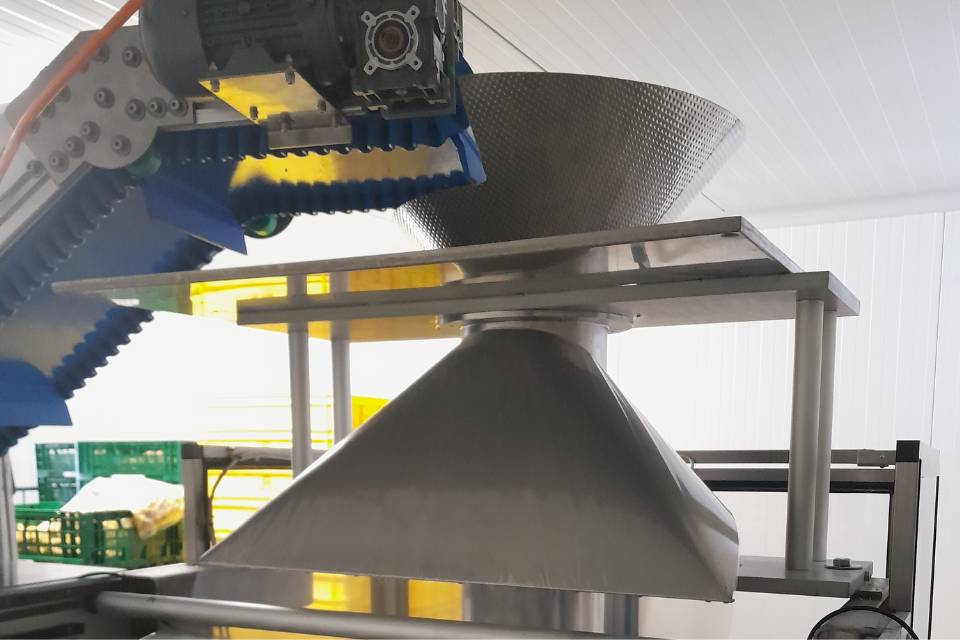 Alles is op elkaar afgestemd; de met vakken uitgeruste invoerbaan, de weger (waar ze zelf al over beschikten) en omhooglopende afvoerband.
